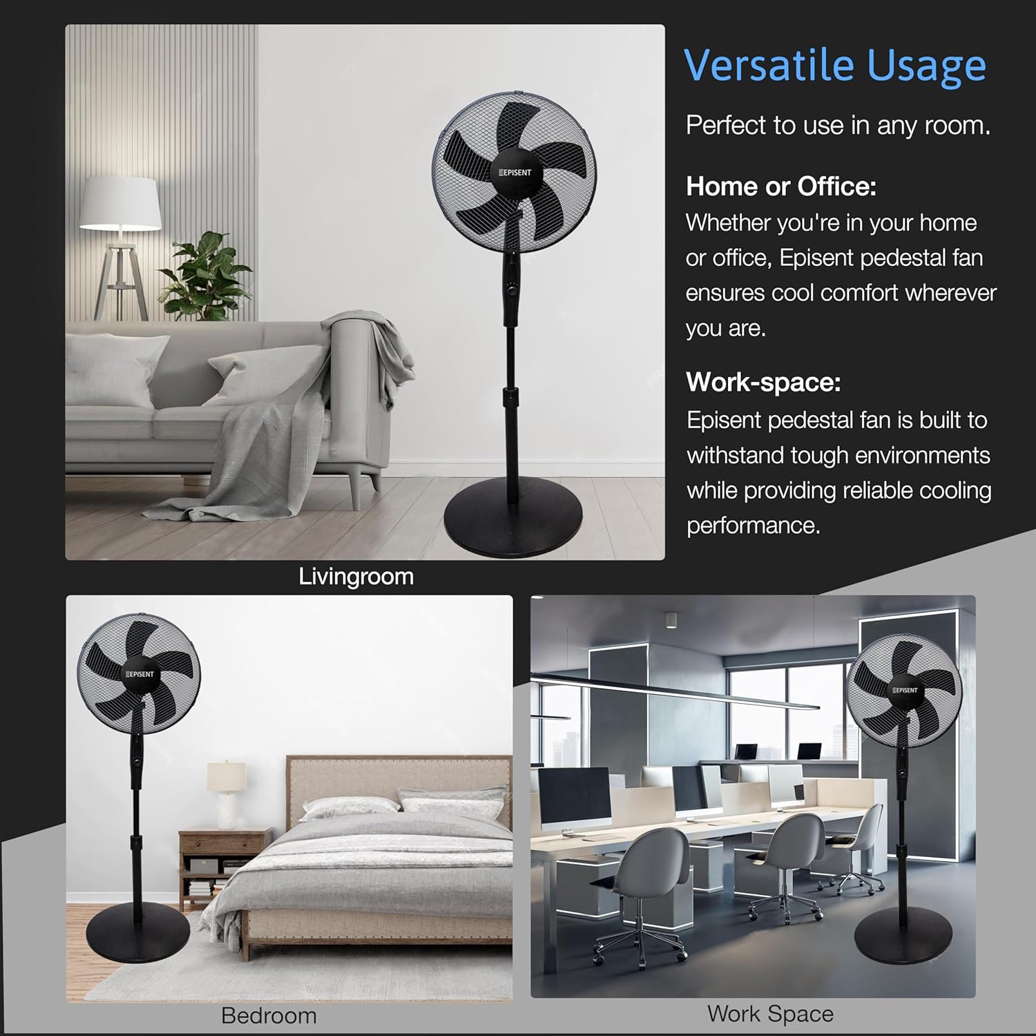 EPISENT 16'' Pedestal Matt Fan | Adjustable Height 140cm | Oscillating & Manual Head Pivot | Rotary Knob Speed Control | Standing Fan for Home & Office (BLACK)