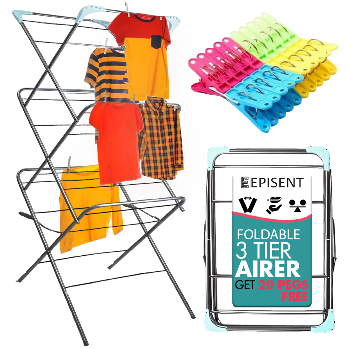 EPISENT 3 Tier Foldable Clothes Airer & Drying Rack Large Laundry Dryer Stand for Indoor & Outdoor Use, Space-Saving Collapsible Design with Non-Slip Feet & Hanger Hooks Includes 20 FREE Pegs
