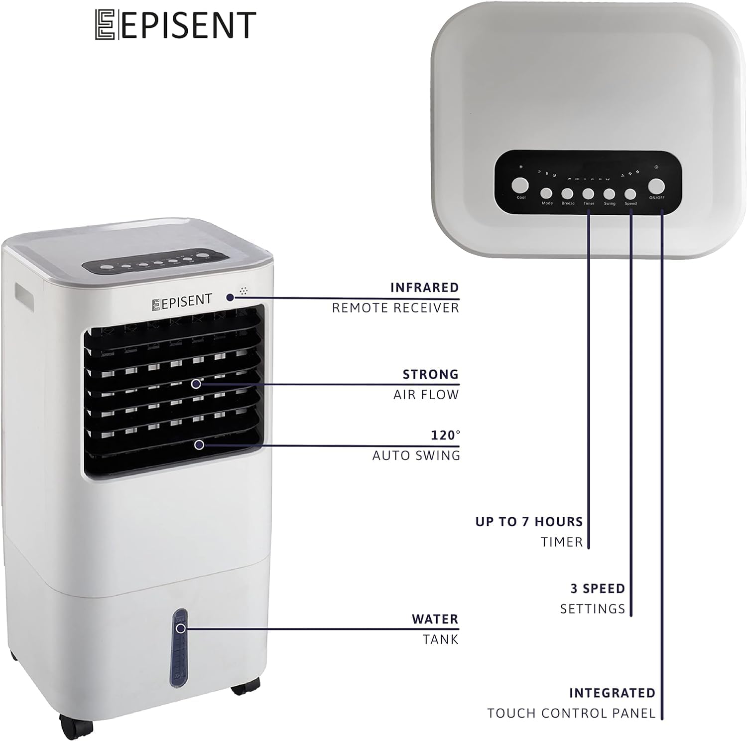EPISENT 4-in-1 Portable Evaporative Air Cooler 15L Water Tank, Remote Control, 3 Fan Speeds, LED Display, 7.5-Hour Timer, Auto Oscillation Energy-Efficient Cooling for Home & Office